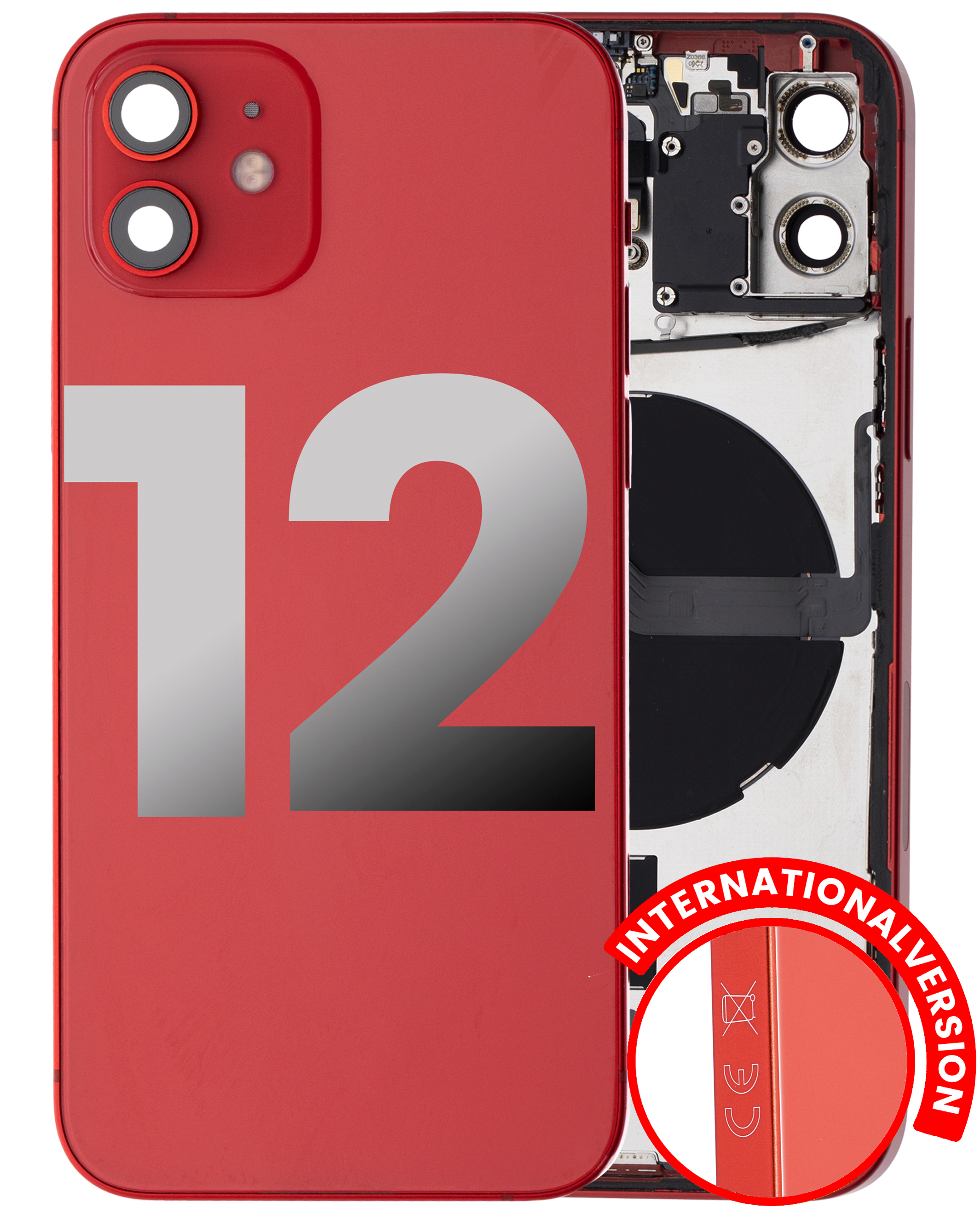 • Superb quality Back Housing W/ Small Components Pre-Installed for iPhone 12 (International Version) (Used OEM Pull: Grade B) (Red).