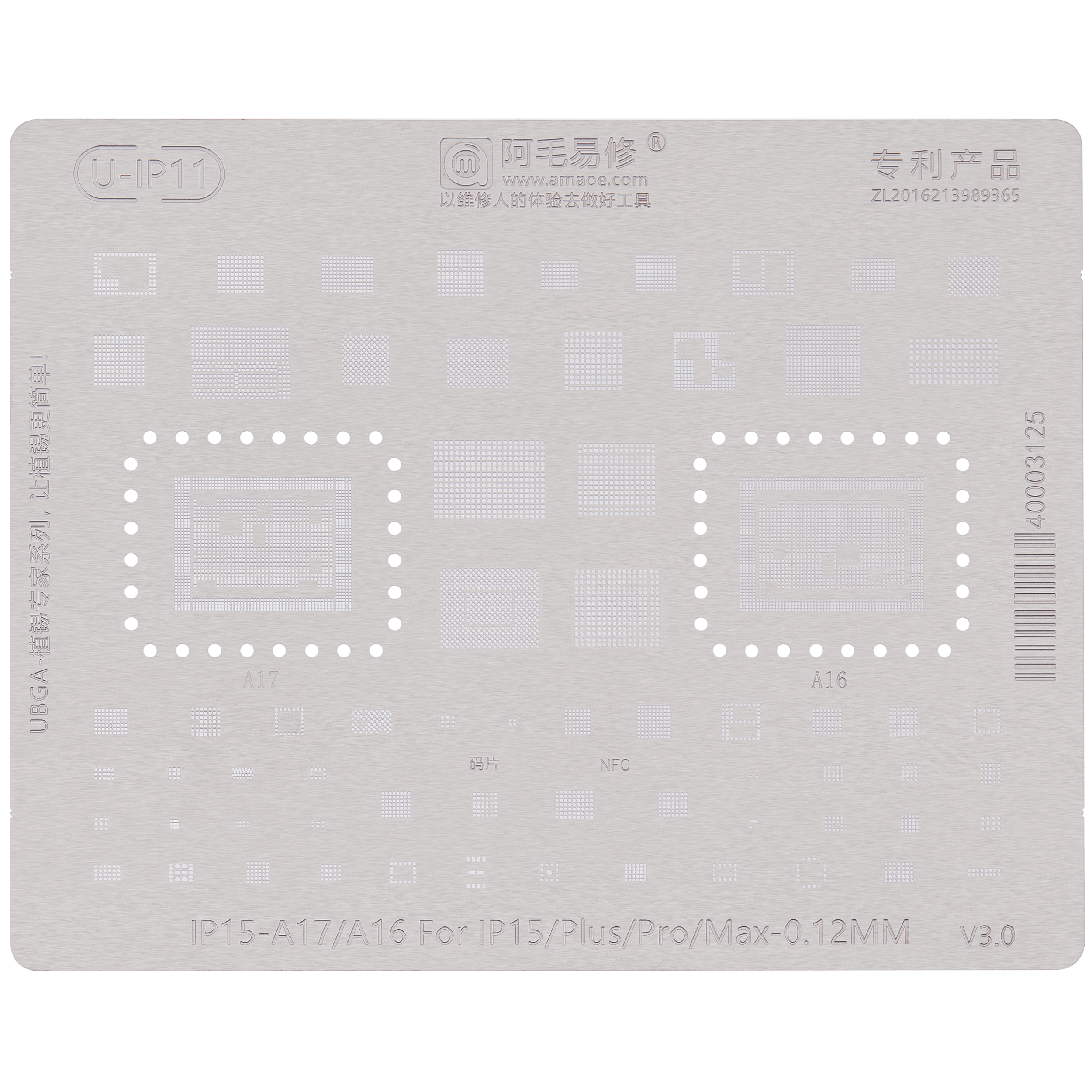 U-IP11 0.12MM A16/A17 Universal CPU Rework Repair BGA Reballing Stencil Compatible for iPhone 15 Series (Amaoe) (V3.0)